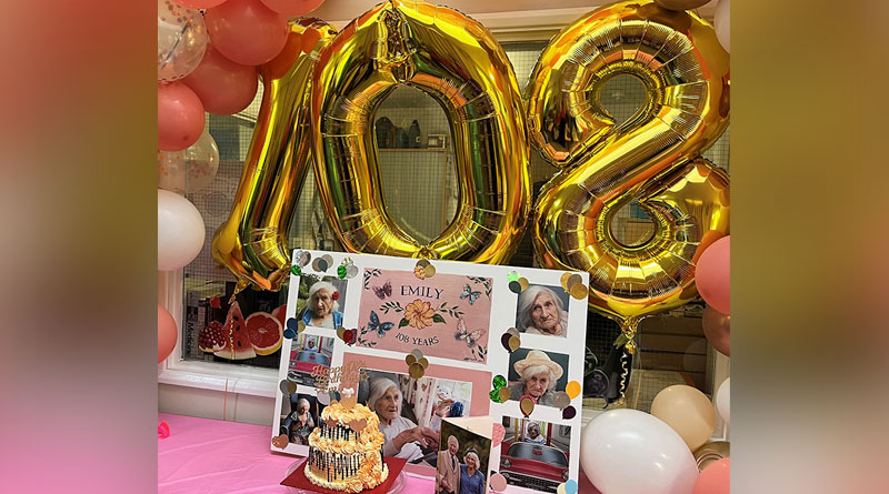 To honour Emily’s 108th birthday, the Care Home hosted a joyful party filled with music and colour. The festivities included a live performance from her favourite local singer, a beautifully decorated birthday cake and eye-catching decorations, including 108 balloons and a special message from the King and Queen.