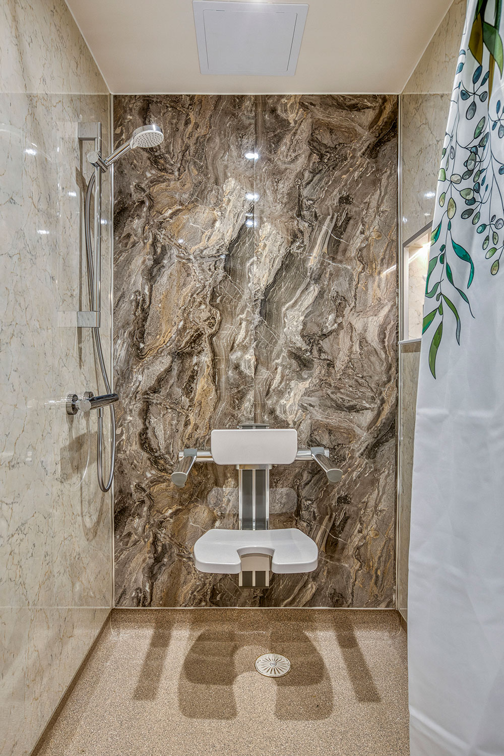Slip-resistant vinyl wet room flooring was combined with Multipanel’s waterproof wall panels to create level-access, easy-to-navigate spaces. The design meets both Lifetime Homes and accessibility standards, ensuring long-term safety and usability.